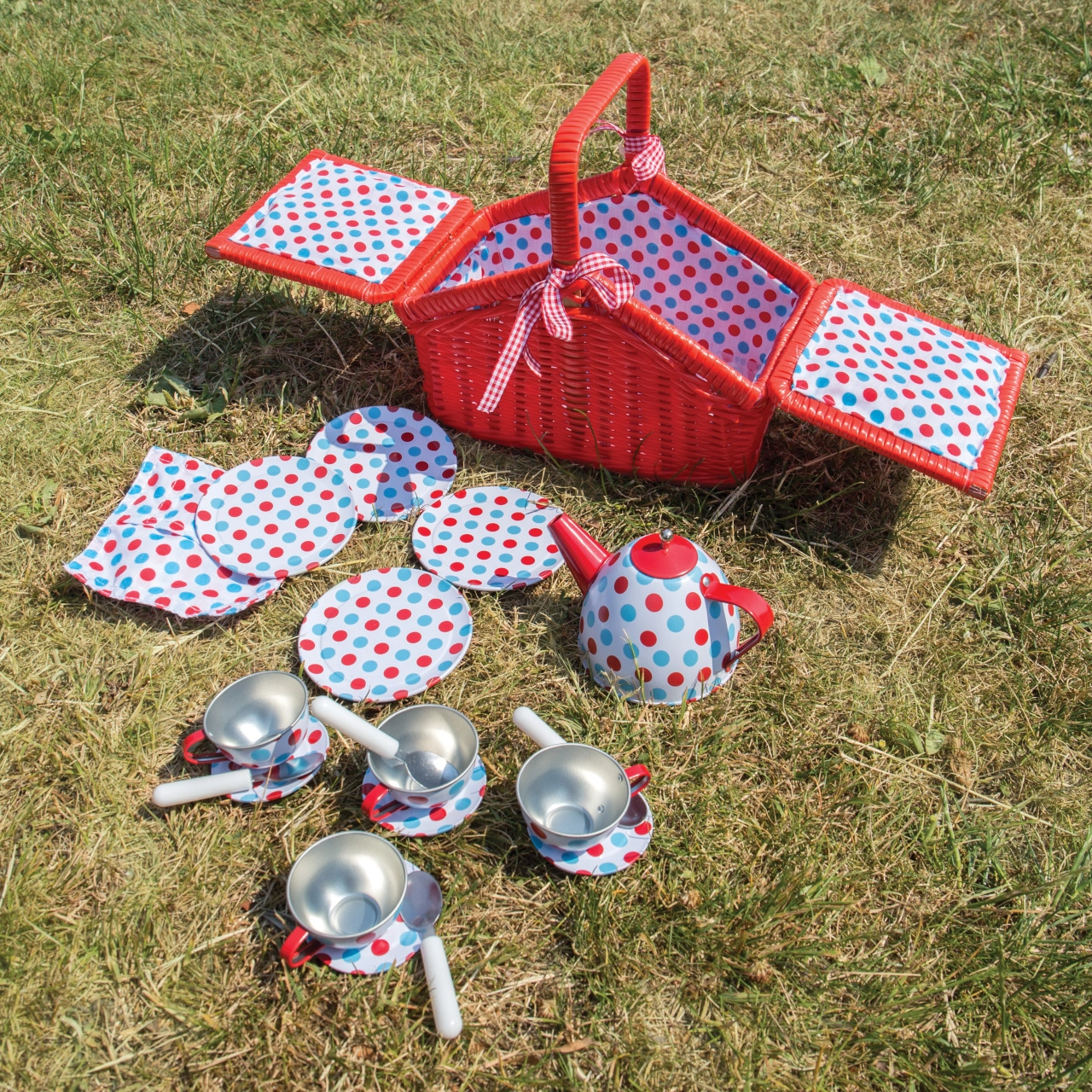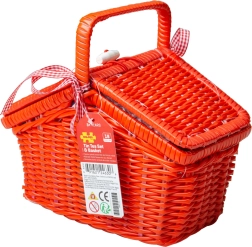 Võluv teekomplekt punases vitstkorvis toob mängurõõmu. Sisaldab nelja tassi, taldrikuid, teekannu ja teesegamislusikaid – ideaalne laste teejooja-mängudeks nii kodus kui ka teel.