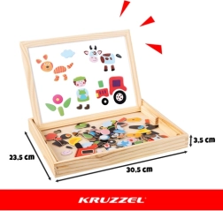 Lastele alates 3. eluaastast mõeldud loominguline kahepoolne KRUZZEL tahvel ühendab valge magnetpinna kujundite kokkupanekuks ja markeriga kirjutamiseks ning musta kriidipooli joonistamiseks. Komplektis on 108 värvilist magnetdetaili, kuivmarker, kriidid, käsn ja praktiline puidust karp hoiustamiseks. Suurepärane abivahend peenmotoorika, loogilise mõtlemise ja loomingulisuse arendamiseks ilma ekraanideta.
