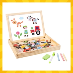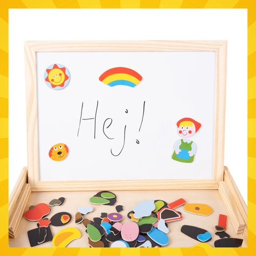 Avastage nutikas mänguasi, mis kasvab koos teie lapsega. Kahepoolne tahvel pakub kaks maailma – valge magnetpool loomade, tegelaste ja sõidukite kokkupanekuks ning kuivmarkeriga kirjutamiseks, ja must kriidipind vabaks joonistamiseks. Kõik on paigutatud kompaktsesse puidust karpi, mis toimib ka alusena.