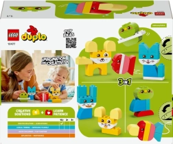 Avastage väikeste esimene ehituskomplekt – LEGO DUPLO Armsad loomingulised lemmikloomad 3‑ühes. Komplekti 24 suurt klotsi võimaldavad lastel alates 18. elukuust lihtsalt kokku panna koera, kassi ja linnu. Toetab peenmotoorikat, värvide äratundmist ja loomingulist mängu tänu lihtsale ehitamisele ja sõbralikele näoilmetega trükistele.