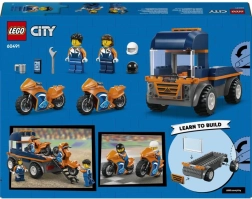 Avasta väikelaste võidusõiduhoos ehituskomplekt: LEGO City mootorrataste veok pakub tasast veoplatvormi koos rampiga, 2 sportmootorratast, 2 kiivriga võidusõitja minifiguuri ja võimsaid kummirehve stabiilseks sõiduks. Ideaalne alates 4. eluaastast tänu algajatükile ja lihtsale juhendile.