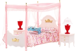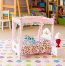 Selle stiilse mööblikomplektiga lood nukkudele hubase ja luksusliku magamistoa. Pilgupüüdjaks on romantilise baldahhiiniga voodi koos õrnade kardinatega, mis annab stseenile muinasjutulise õhustiku. Täpsed detailid ja harmooniline roosa-valge värvilahendus kutsuvad mängima ja looma stiilseid stseene.