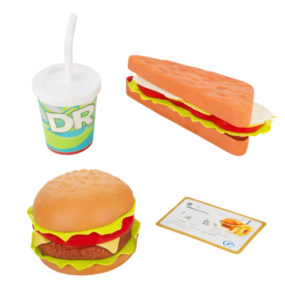 Burger, baguette ja jook loovad restoranistsenaariumi. Lapsed saavad tellida, serveerida ja maksta – täielik kiirtoidukogemus.