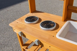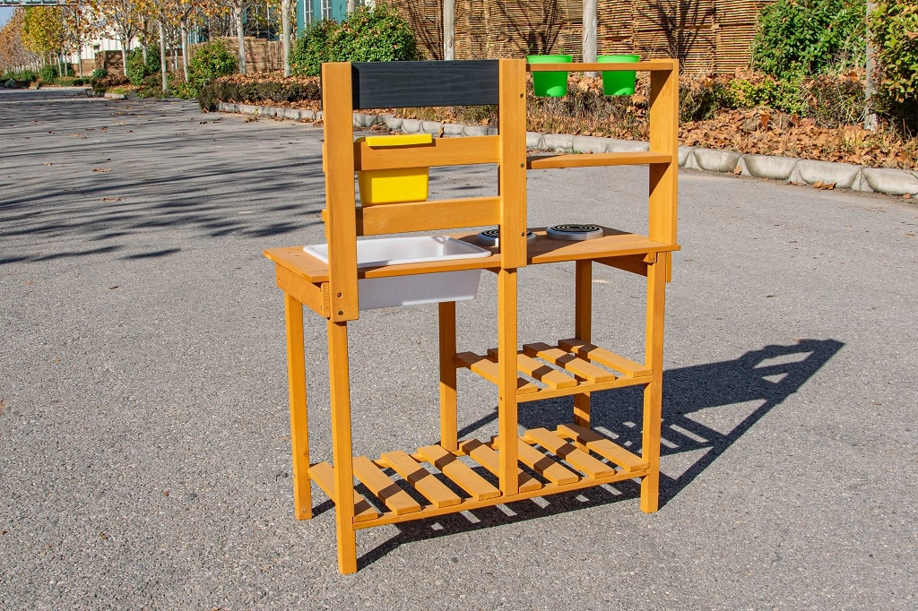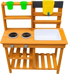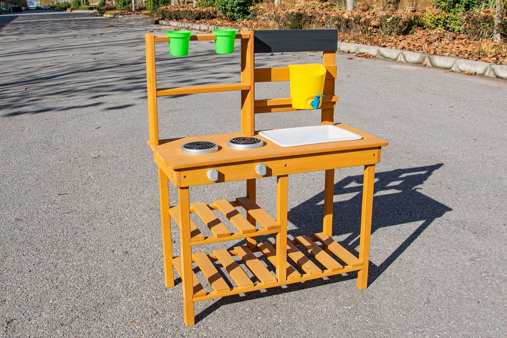 See välitingimustesse mõeldud laste köök sobib suurepäraselt “mud kitchen” tegevusteks ja klassikalisteks kokkamismängudeks. Tugev puidust konstruktsioon on lihtsasti hooldatav ning pakub stabiilset tööpinda kahe keedualuse, plastist kraanikausi ning praktiliste konksude ja hoidikutega tarvikutele. Kraaniga veepaak võimaldab turvalisi ja lõbusaid vee-eksperimente.
