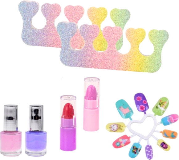 - Rikas sisu: 2× küünelakk, 2× laste huulepulk, 14× lauvärv, aplikaatorid, kleebised ja küünetipid, küüneviil, sõrme eraldajad ja muu.