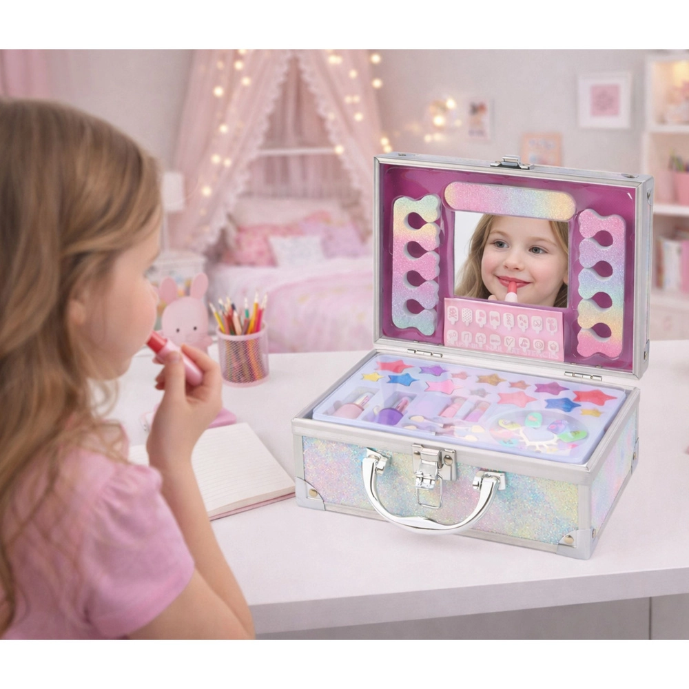 Stiilne laste kohver säravas viimistluses on ideaalne väikestele meigihuvilistele. Seest leiab kõik vajaliku grimminäitlejaks mängimiseks – läiked ja lauvärvid kuni lakkide, kleebiste ja laste küünetippideni. Sisseehitatud peegel muudab kohvri praktiliseks mini tualettlauaks ning võimaldab mugavat meikimist ka reisidel.