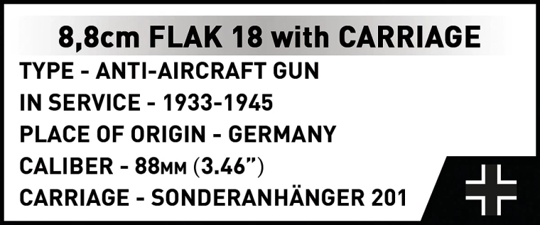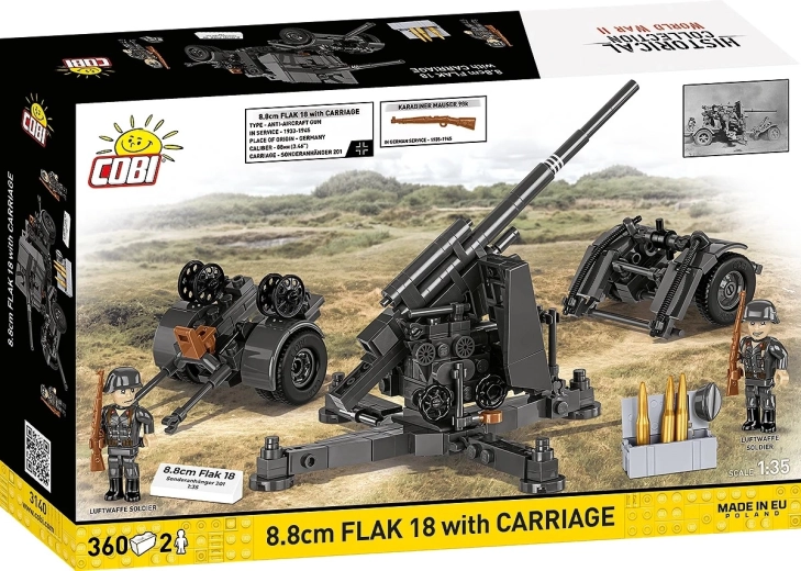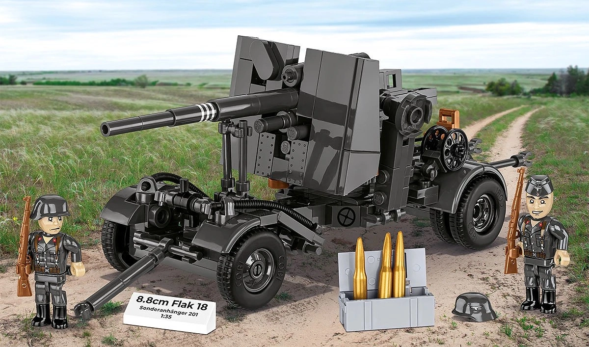 Pane kokku legendaarne Saksa kahur 8,8 cm FLAK 18 koos detailse käruga ja lisanditega. Komplekt 360 detailiga pakub realistlikku teostust, reguleeritavat tõstenurka ja stabiilset ristjalgset alust – ideaalne kollektsionääridele, ajaloohuvilistele ja ehitusklotside fännidele.