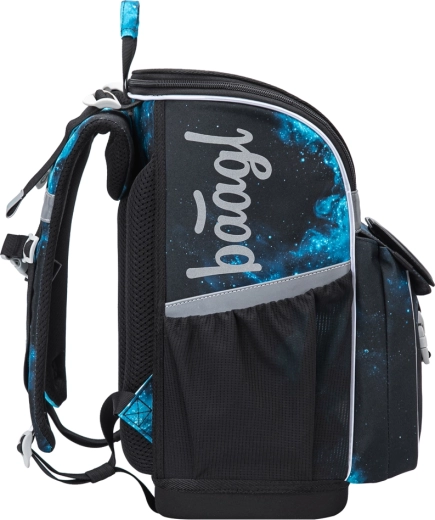 Lahtipööratav kaas mugavaks asjade paigutamiseks pingilt, mahukas põhiosa sisemise taskuga, kaanes võrgust tasku, kummiriba õpikute fikseerimiseks ja küljetaskud pudelile.