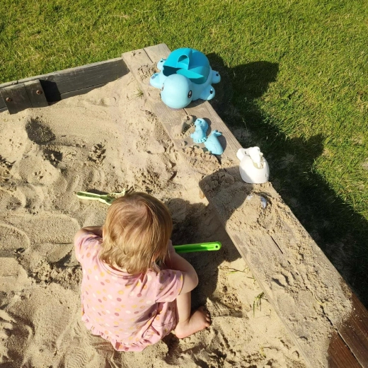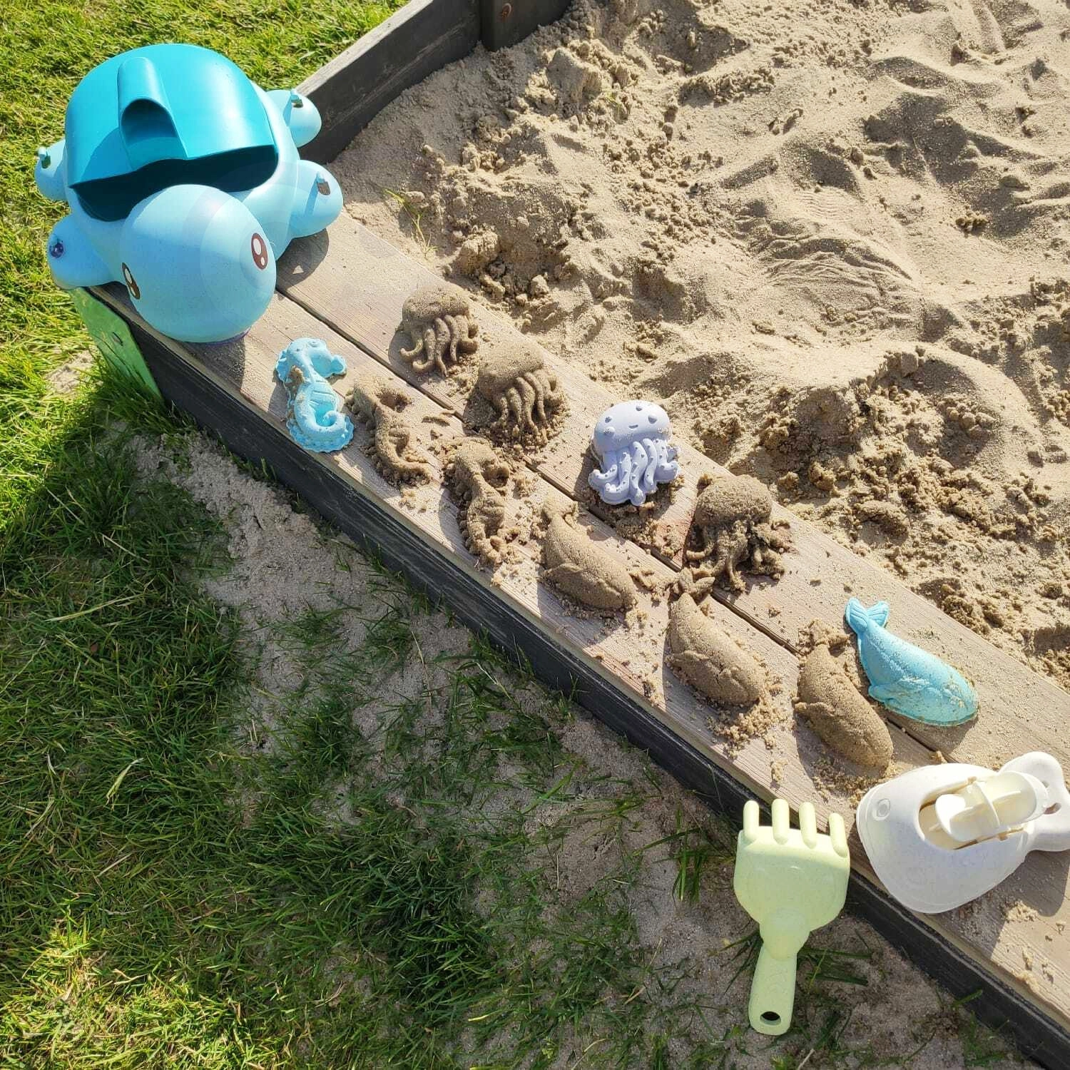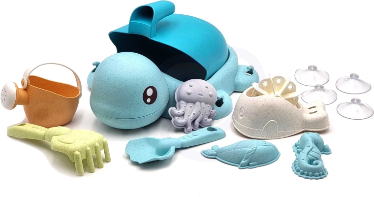 Vormid, kühvel, reha, lusikas, kastekann ja iminappadega veeratas toetavad loomingulist mängu, meelte arengut ja motoorikat.