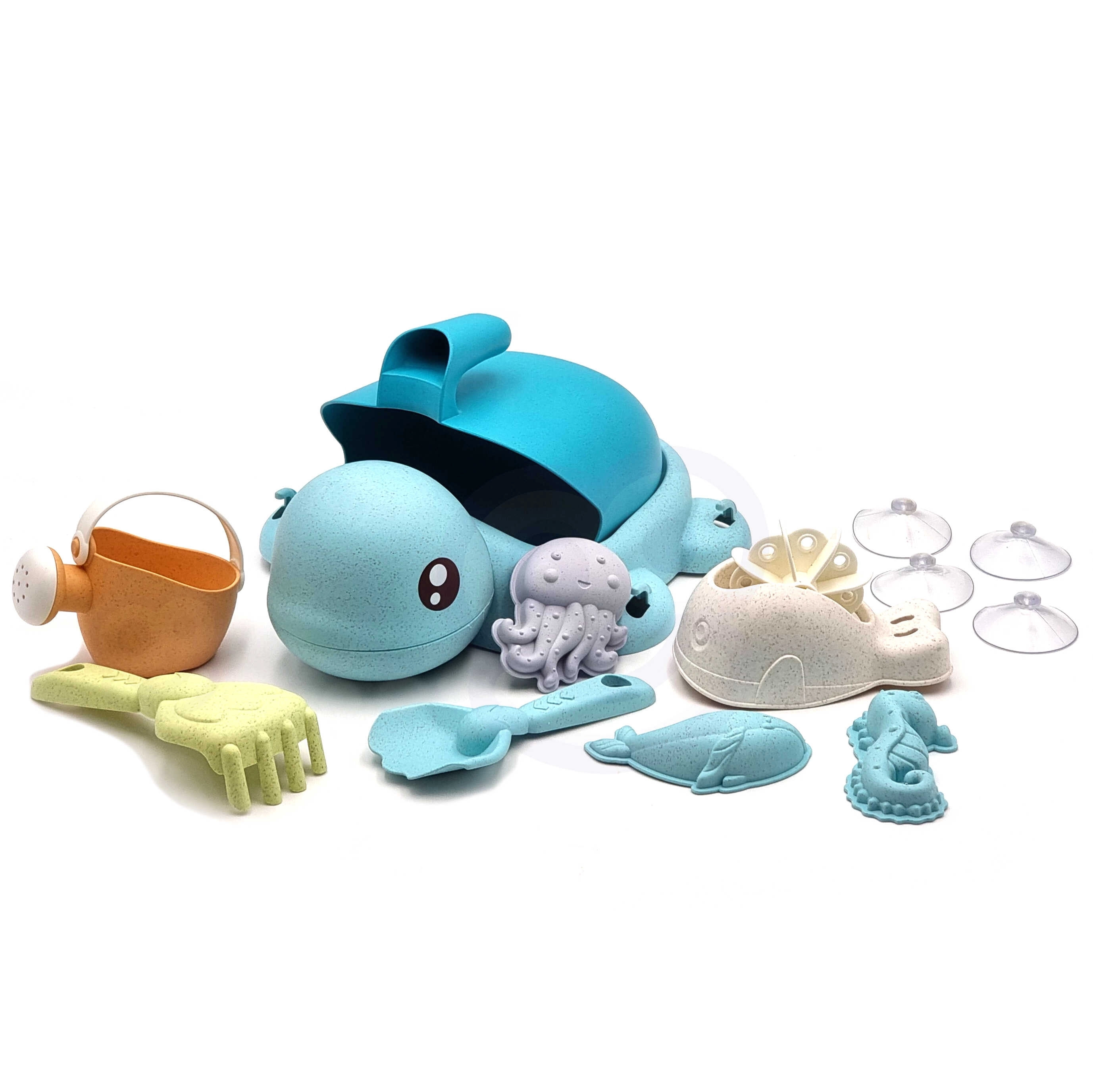 - 8-osaline komplekt: kilpkonn–karp, kühvel, reha, lusikas/kulbik, kastekann, 3 vormi ja iminappadega veeratas.