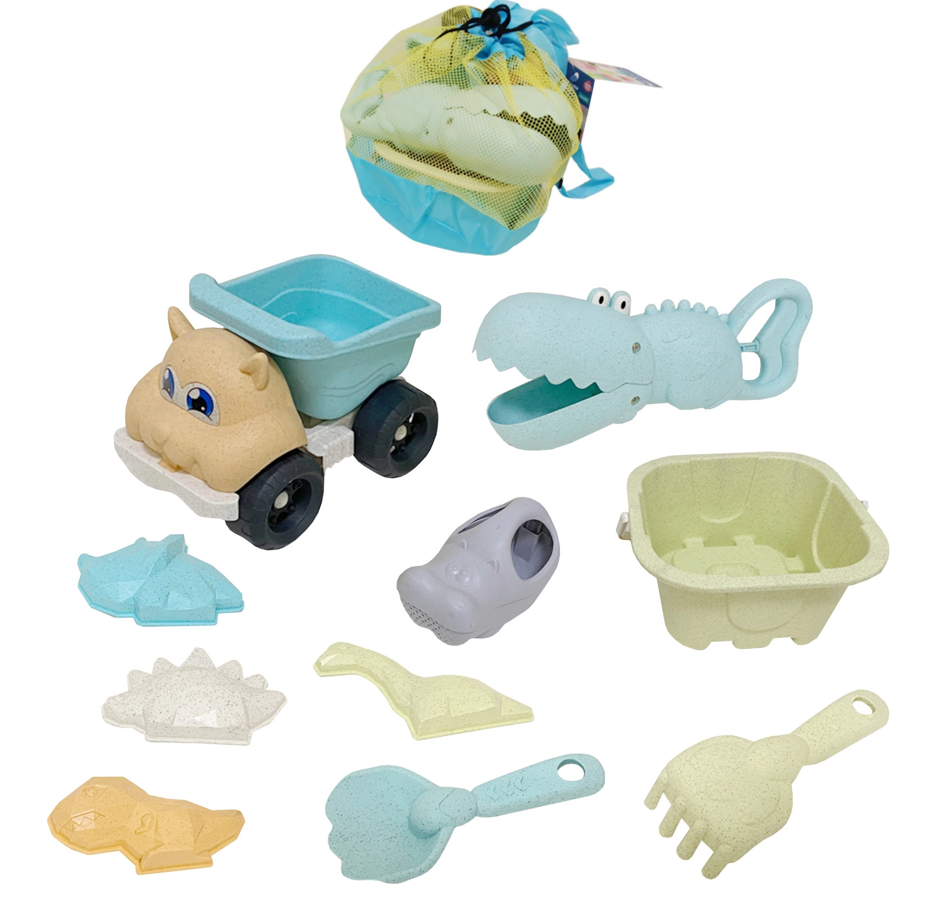 Ämber, kastekann, 4 vormi, kühvel, krokodilli haare, reha ja väike kallurauto – täielik varustus liivalossideks ja veemängudeks.