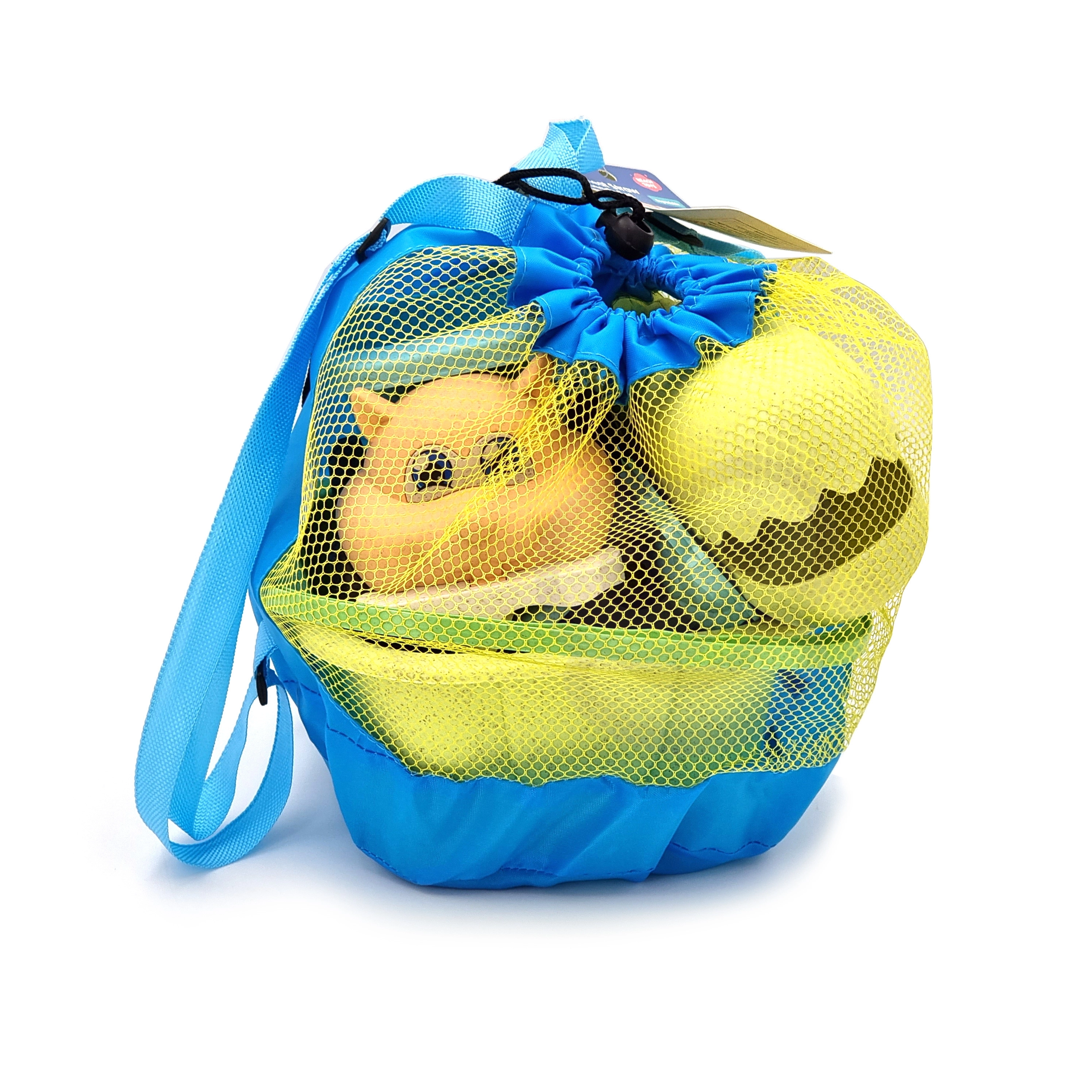Kerge võrkkott toimib seljakotina – lihtne kaasas kanda, mänguasjad tilguvad ja kuivavad kiiresti ning pärast randa jääb kotti vähem liiva.