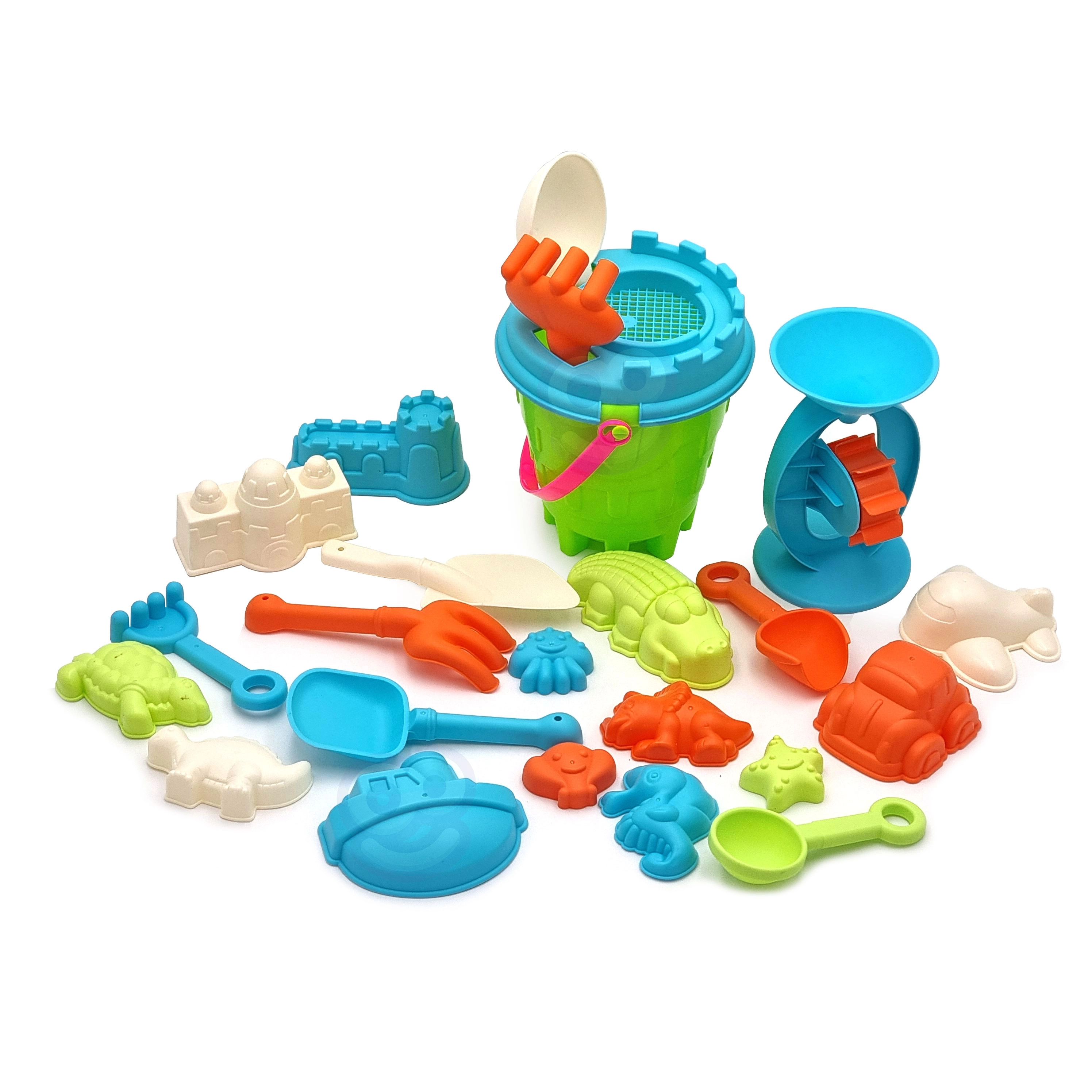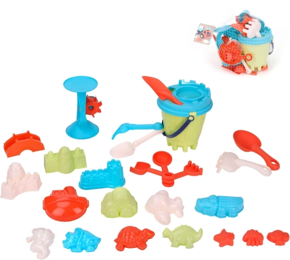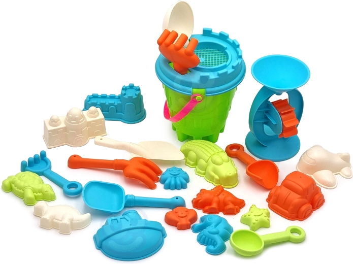 Sõelaga ämber, veski, 15 vormi, 4 labidat ja 3 paari rehasi – kõik, mida lapsed vajavad loovaks liivamänguks.