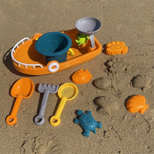 Labidas, reha, sõel, ämber ja mereteemalised vormid toetavad loovat ehitamist, sõelumist ja vormimist rannas ning liivakastis.