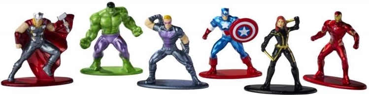 - 6 metallist miniatuurfiguuri (Captain America, Iron Man, Hulk, Black Widow, Hawkeye, Thor)