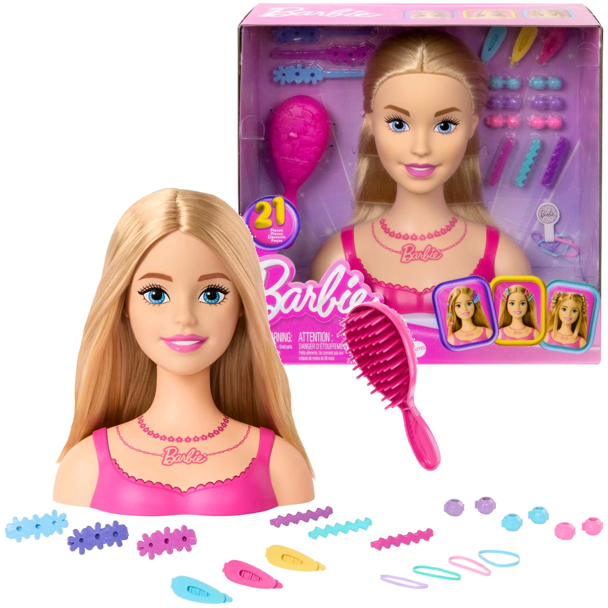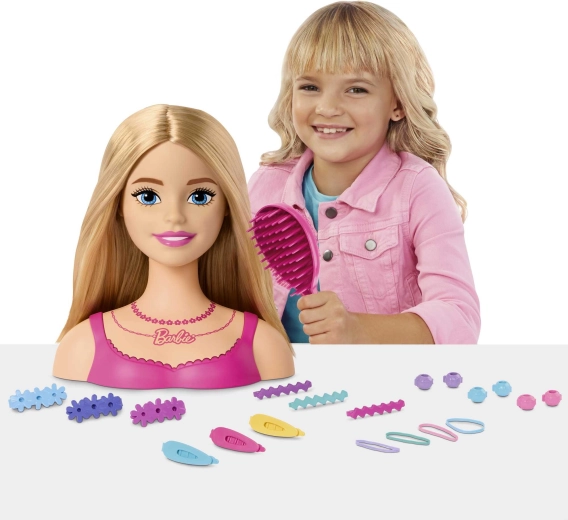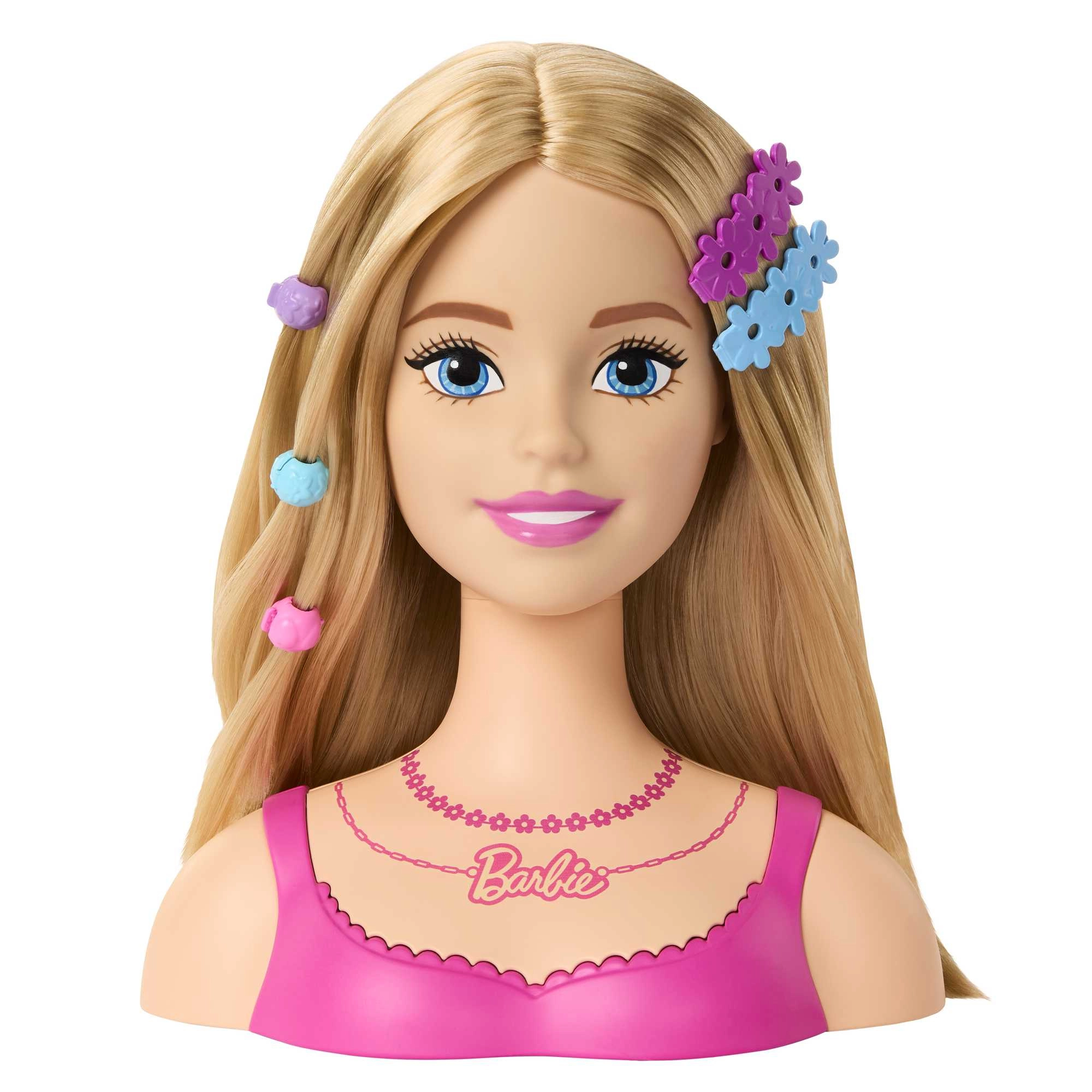 Elegantne büst roosa topi ja BARBIE kaelakeega mõjub realistlikult ja kutsub väikeseid juuksureid loovmängule.