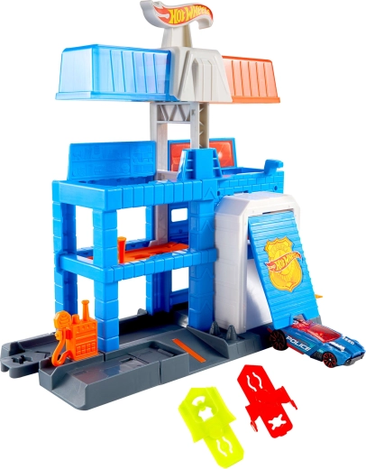 Komplektis on 1:64 metallist politseiauto ning rohkelt liikuvaid lisasid, mis arendavad peenmotoorikat ja kujutlusvõimet. Tänu ühilduvatele ühendustele saab komplekti lihtsalt ühendada teiste HOT WHEELS radadega ja ehitada ulatuslikke linnaosasid.