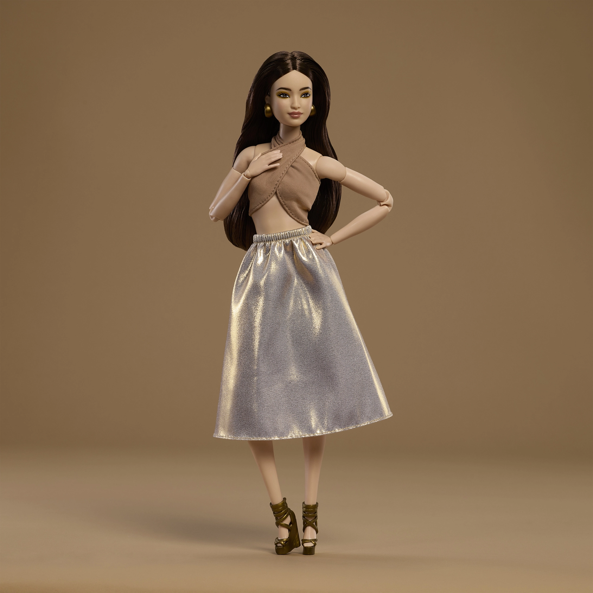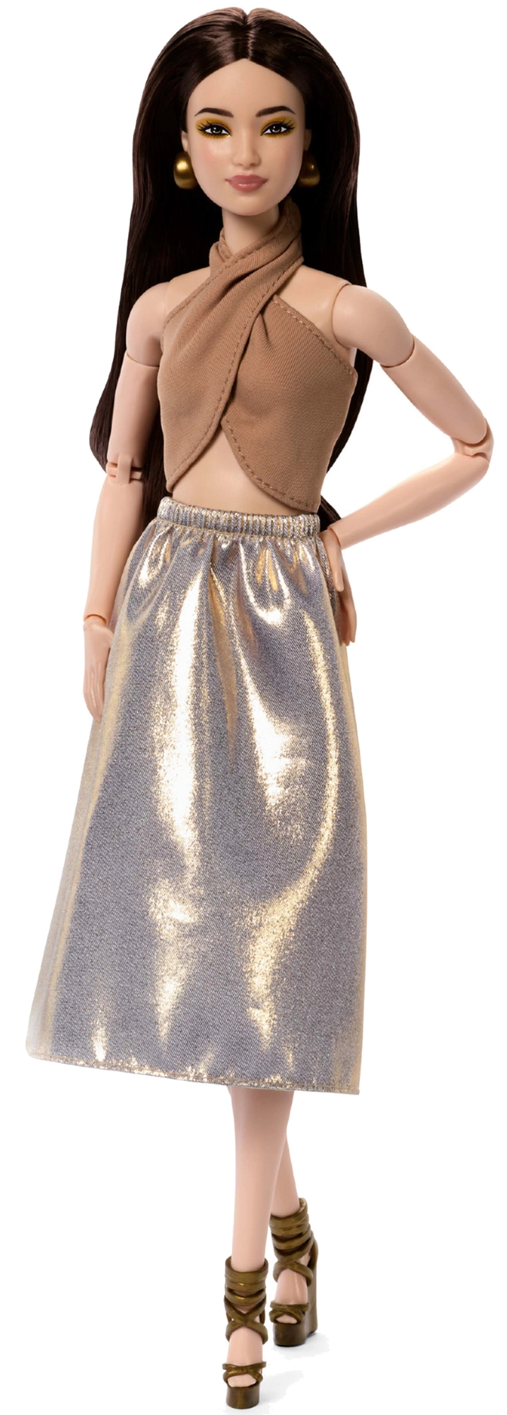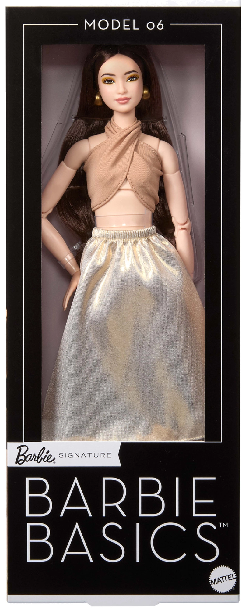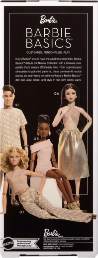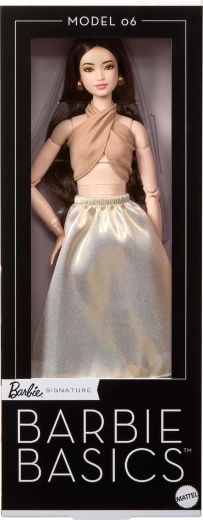 Mudel 06 sarjast Barbie Signature Basics toob minimalistliku elegantsi helepruunides ja kuldsetes toonides. Elegantse topi ja lendleva seeliku kooslus rõhutab modernset, ajatult šikki ilmet. Nukul on hele jume, saledad proportsioonid ja kooskõlaline, diskreetne meik, mis toob esile tema loomuliku ilu.