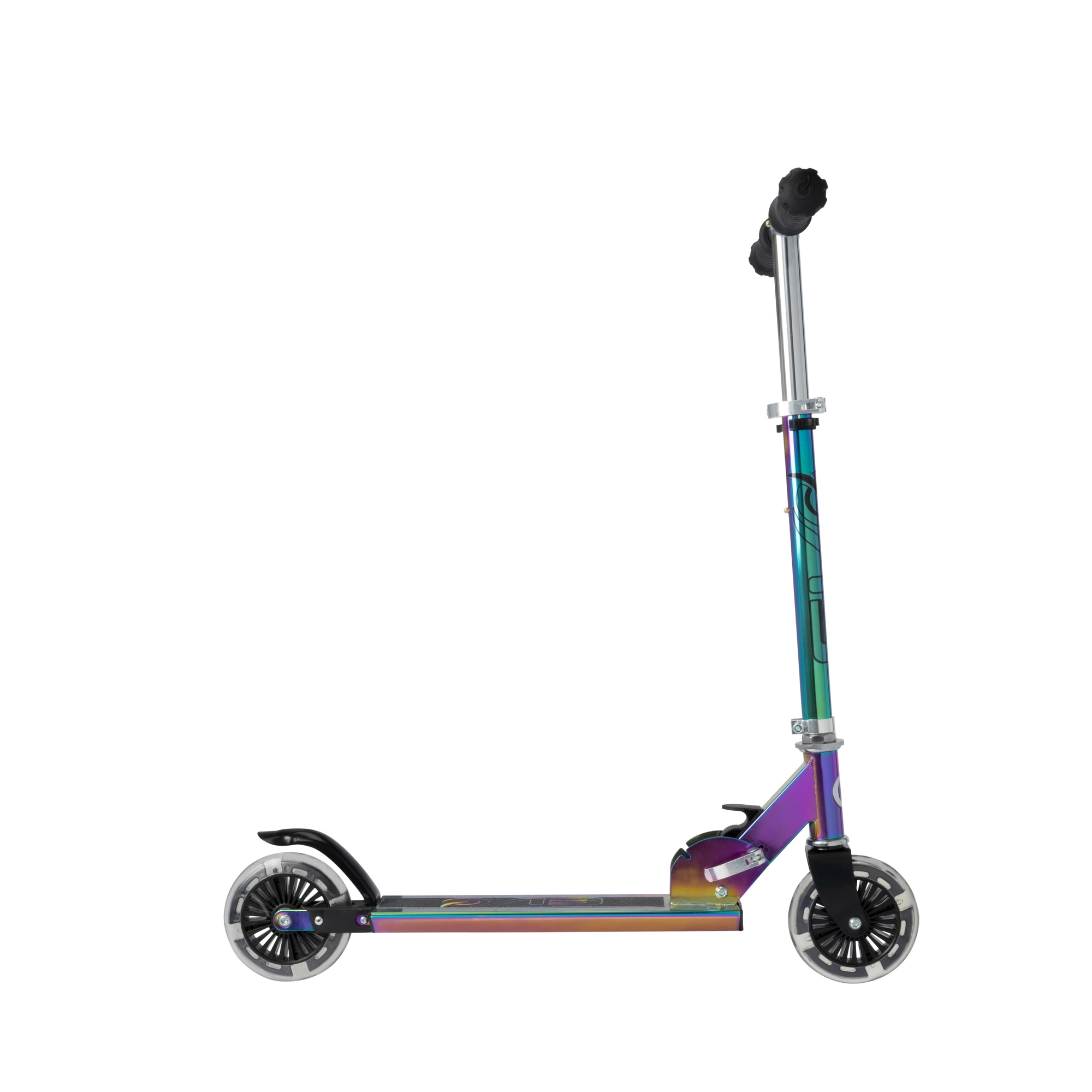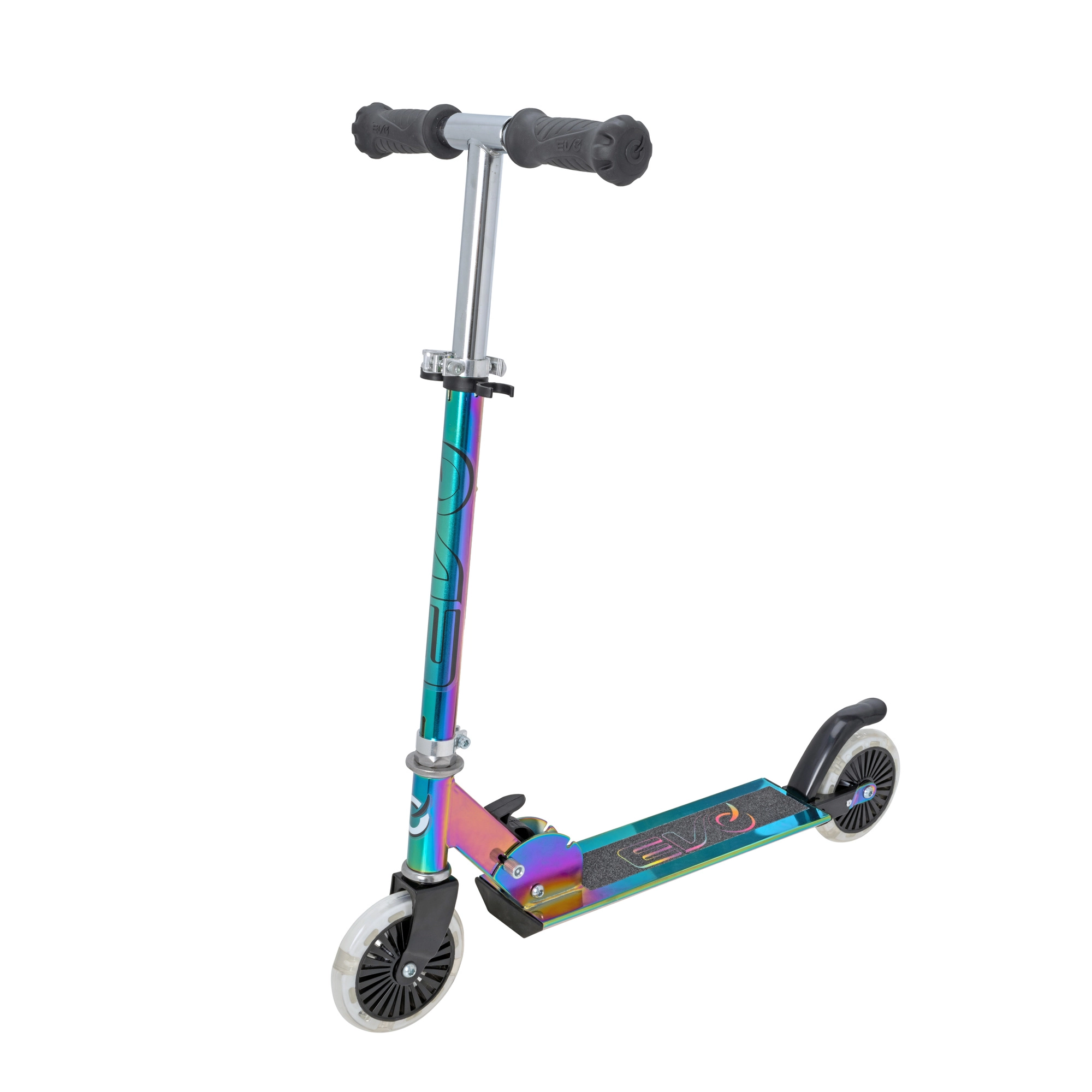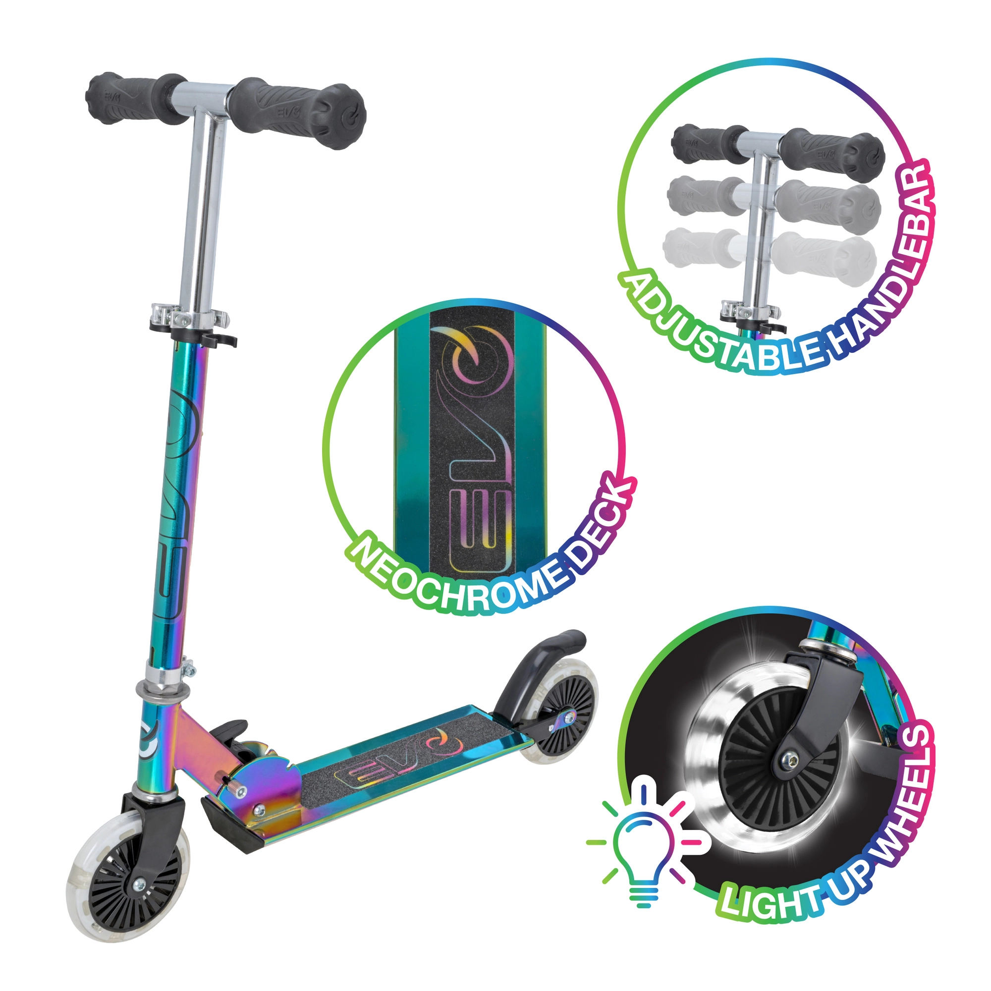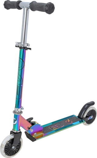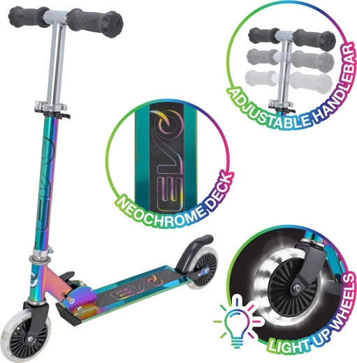 EVO Light Up Neochrome tõukeratas on suurepärane valik väikestele sõitjatele, kes soovivad silma paista. Tänu reguleeritavale juhtrauale (u 67–77 cm) kasvab see koos lapsega, kokkupandav mehhanism lihtsustab kandmist ja hoiustamist ning vastupidav metallkonstruktsioon libisemiskindla astmepinnaga annab sõites kindlust.