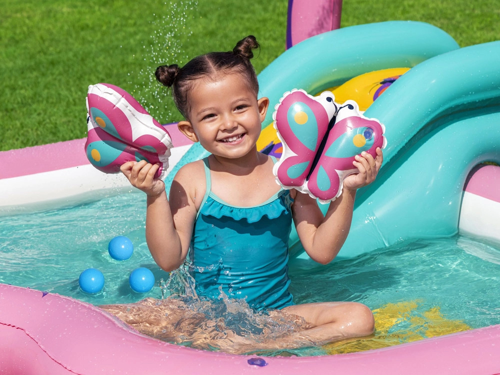 Tee suvepäevad säravamaks Bestway Liblikas mängukeskusega – armas, turvaline ja lõbus veemänguala lastele alates 2. eluaastast. Komplektis on pehme liumägi, õrna värskenduse pakkuv kaarjas dušš ning interaktiivsed pallide sorteerimisavad. Värviline pastelltoonides disain ja täispuhutavad lisad toetavad liikumist, koordinatsiooni ja loovat mängu aias.