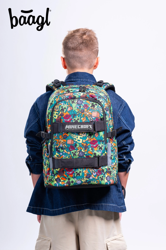 BAAGL Minecraft Chaos koolikomplekt ühendab armastatud pikseldisaini funktsionaalse varustusega kooli ja vaba aja jaoks. Kerge Skate seljakott mahuka organiseerijaga hoiab koolitarbed korras ning pakub polsterdatud taskut 15" sülearvutile, samas kui pinal, kott ja vöökott lisavad mugavad lahendused pisitarvikute ja spordiasjade hoiustamiseks.