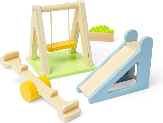 Muuda oma nukumaja aed liikumise ja fantaasia keskuseks. Komplekt sisaldab mänguväljaku lemmikelemente – kiik, liumägi, kaalukiik (kiik) ja dekoratiivne lillepeenar. Tänu siledatele puidust detailidele mahedates pastelltoonides on käsitsemine meeldiv ja turvaline.