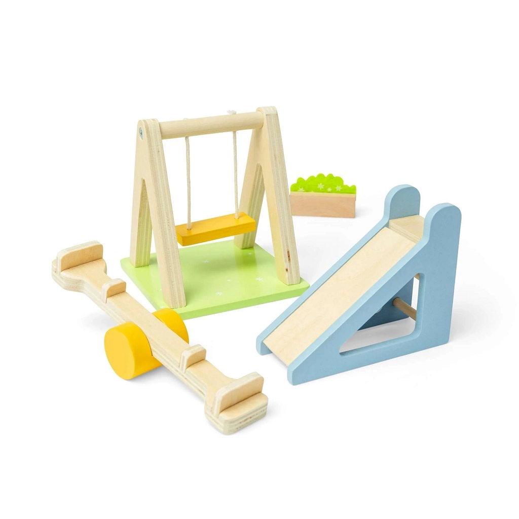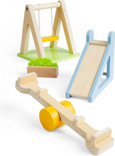 Lisa oma nukumajale päris mänguväljaku tunne selle kauni Bigjigs Toysi komplektiga. Komplektis on kiik, liumägi, kaalukiik (see-saw) ja lillepeenar loovaks mänguks. Valmistatud FSC®-sertifitseeritud puidust, turvaline, vastupidav ja loodussõbralik. Toetab suurepäraselt peenmotoorikat, koordinatsiooni ja rollimängu alates 3. eluaastast.