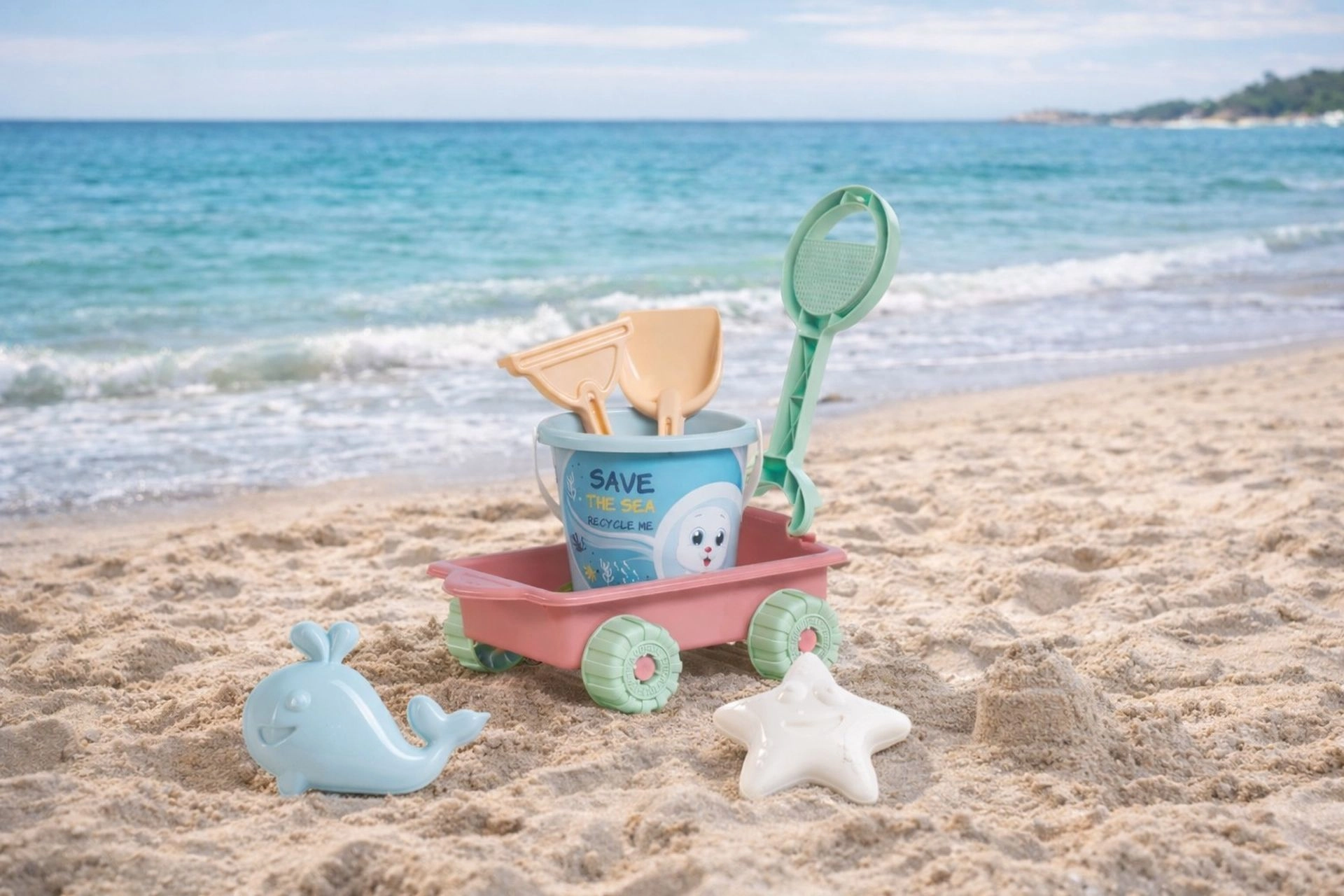 Ämber, kühvel, rehad ja kaks vormi (kalake ja meritäht) arendavad kujutlusvõimet ja peenmotoorikat. Kõik on kaunites pastelltoonides.