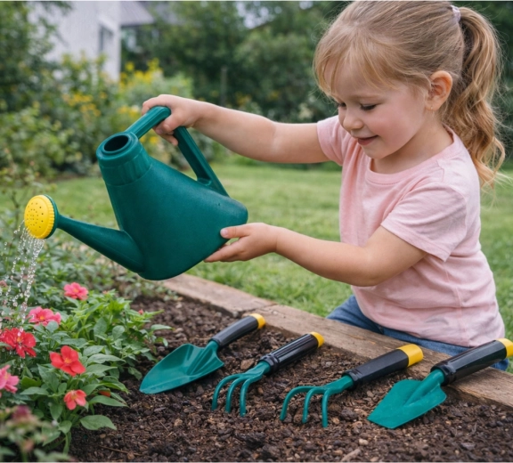 Arendage laste kujutlusvõimet aias selle täieliku komplektiga väikestele aednikele. Komplektis on kerged ja ohutud tööriistad ergonoomiliste käepidemetega, praktiline kastekann ning kaasaskantav kast lihtsaks hoiustamiseks. Toetab loovust, peenmotoorikat ja looduse tundmaõppimist mängu kaudu.