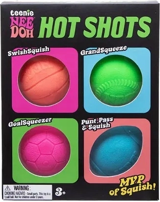 Antistress-pallid NeeDoh Hot Shots on populaarsed sotsiaalmeedias ning kuuluvad lemmikute hulka sensoorsete mänguasjade seas lastele alates 3. eluaastast. Igal pallil on erinev tekstuur; neid saab pigistada, venitada ja visata ning materjal naaseb alati esialgsesse vormi. Suurepärased lõõgastumiseks, tähelepanu tõstmiseks ja päeva jooksul rahunemiseks.