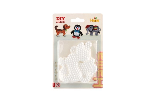 Hama triikhelmete aluste komplekt võimaldab lastel alates 5. eluaastast luua värvilisi pilte tänu valgetele plastalustele elevandi, pingviini ja kutsika kujul.