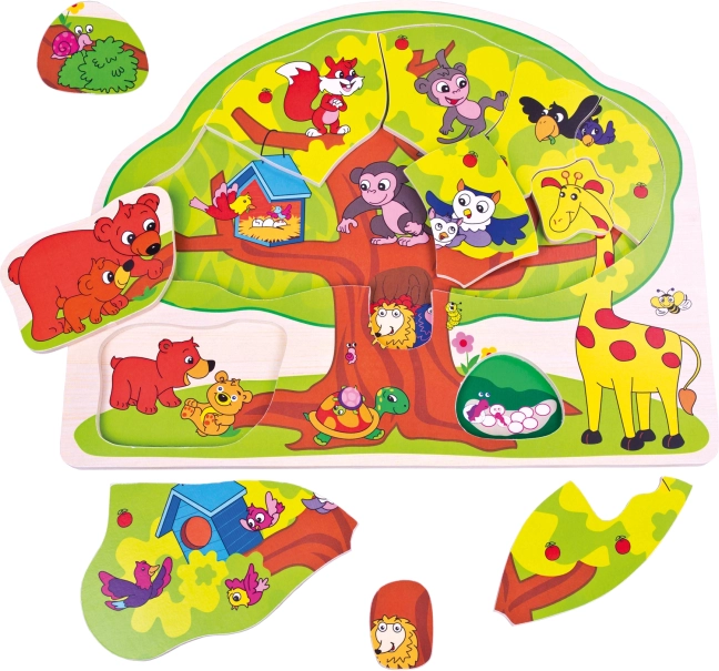 Puslel on puu kuju ning see sisaldab 11 eraldi tükki loomadega ja tugevat alust. Vastupidava vineeri tõttu sobib see suurepäraselt igapäevaseks kasutamiseks kodus ja lasteaias.