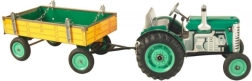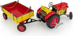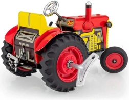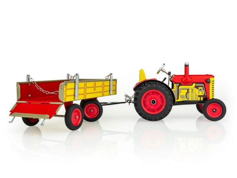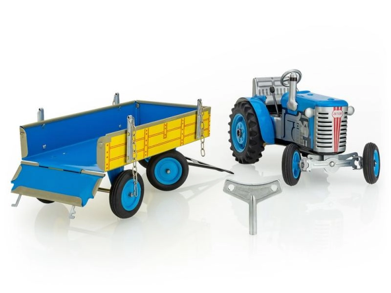 Klassikaline plekkmänguasi väikestele ja suurtele põllumajandustehnika fännidele: Zetor traktor lahtivõetava kallurhaagisega vedrumehhanismiga võtmele. Pakub 3 käiku (edasi, neutraal, tagurpidikäik), toimivat roolijuhtimist ja käsipidurit. Täpne Tšehhi meistritöö, „Ohutu mänguasi” sertifikaat ja vastupidav trükitud plekist konstruktsioon plastikkummidega ratastega.