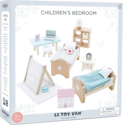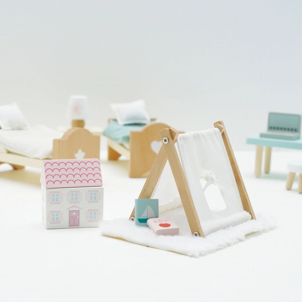 See elegantne 24-osaline nukumaja lastetoa komplekt sisaldab voodeid patjade ja tekkidega, öökappi lambiga, toolikest, vaipa ja dekoratsioone, mis loovad realistliku ilme. Puidust detailid ja pehmed pastelsed toonid lisavad stiili ja elegantsust. Valmistatud eetikaga jätkusuutlikest materjalidest ning värvitud mittetoksiliste veepõhiste värvidega.