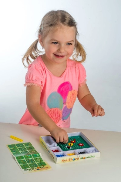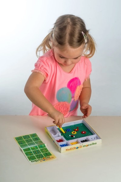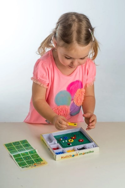 See mosaiik on suurepärane valik esimeseks meisterdamiseks. Lapsed asetavad pintsettide abil värvilised kuulid alusele ja loovad lihtsaid ning leidlikke motiive. Tegevus toetab kannatlikkust, silma–käe koordinatsiooni ja peenmotoorika arengut.