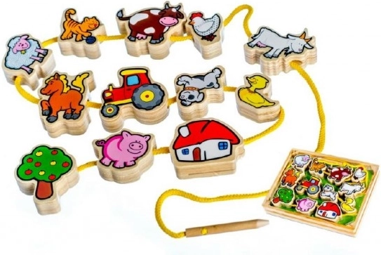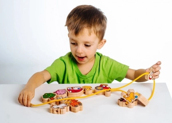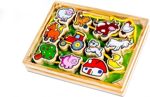 Komplektis on 12 puidust tükki, puidust nõel, puuvillane nöör ja puidust klamber. Lõbusad ja värvikad motiivid on loodud köitma laste tähelepanu ning sobivad suurepäraselt nii õppimiseks kui mänguks.