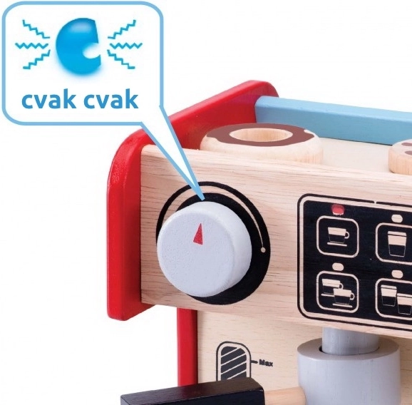 Selle kohvimasinaga saavad lapsed proovida, milline on barista töö. Komplekt sisaldab kohvimasinat eemaldatava kangi ja liigutatava piimadosaatoriga. Kõike täiendab juhtpaneel pööratava klõpsuga nupu ja maalitud nuppudega.
