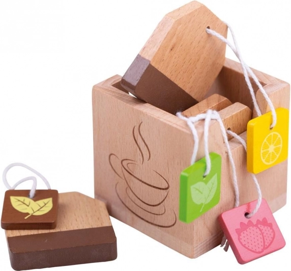 Puidust teekottide komplekt on ideaalne lisa lastemängukööki või mängupoodi. Stiliseeritud kotid populaarsete maitsetega innustavad loovat rollimängu ning õpetavad lastele lauakombeid ja viisakat võõrustamist.