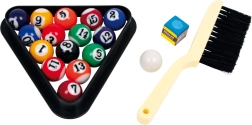 Komplektis on kõik, mida mängu alustamiseks vaja: kaks keppi, kuulid, kolmnurk ja kriit. See mini laud on loodud pakkuma realistlikku kogemust väikesel pinnal.