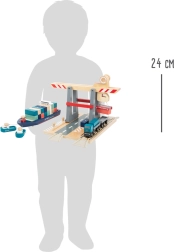 See läbimõeldud sadamakomplekt pakub lastele realistlikku logistikamängu: laev kahe puksiiriga on valmis väljuma, samal ajal kui kraana tõstab värvilisi konteinerid tänu integreeritud magnetitele. Tugevad puidust detailid ja sujuvalt toimivad elemendid arendavad peenmotoorikat, kujutlusvõimet ja kannatlikkust.