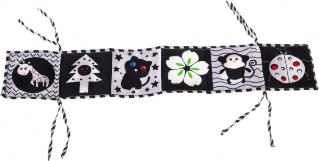 Kontrastne senso-motoorne raamat, mis on loodud voodikaitseks, on ideaalne valik lastele, kes alustavad maailma avastamist. Akordionikujuline raamat saab kergesti paeltega voodi külge kinnitada, pakkudes nii lõbu kui ka turvalisust.
