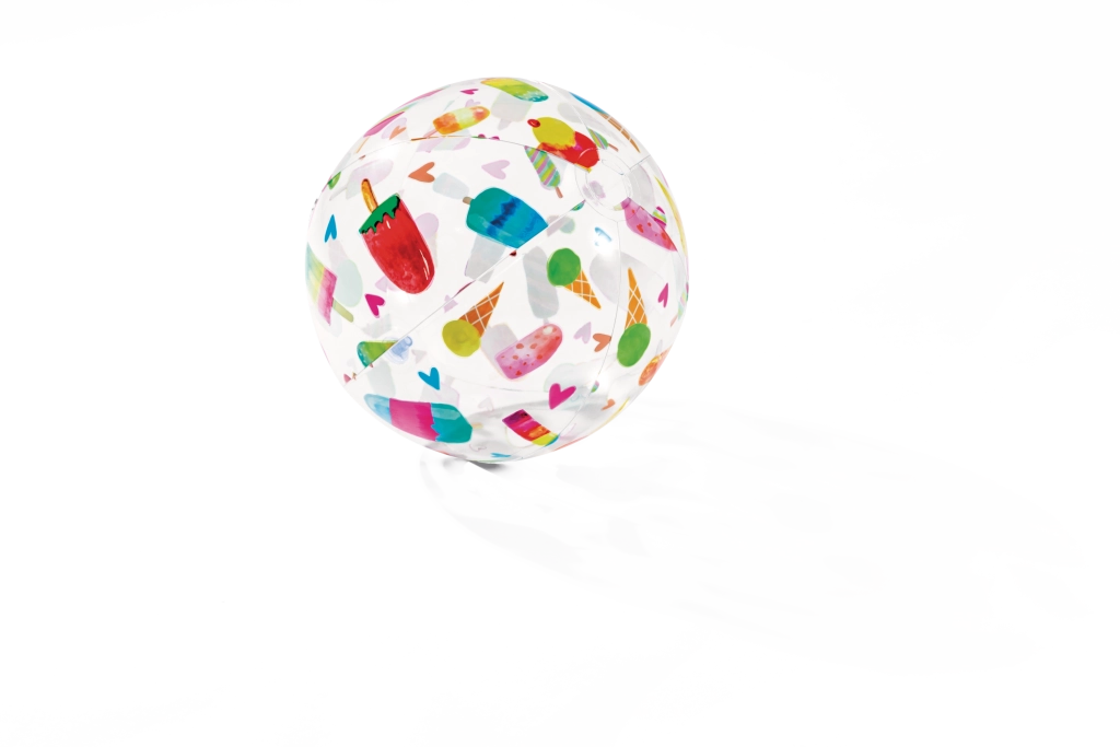 Läbipaistev pall on kaunistatud värviliste puuviljade, jäätiste, kalade ja mereteemaliste mustritega. Motiiv valitakse juhuslikult, kuid tagab alati rõõmsa välimuse ja hea nähtavuse nii vees kui rannas.