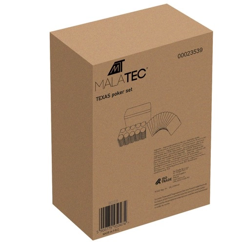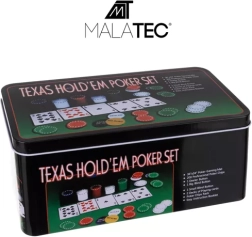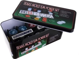 Täielik TEXAS HOLD’EM pokkerikomplekt praktilises metallist karbis, mis sisaldab 200 žetooni eri nominaalidega, 2 kaardipakki, funktsionaalsete žetoonide komplekti (Dealer, Small Blind, Big Blind) ja rohelist mängumatti. Kõik on korrektselt paigutatud žetoonialusele, mis tagab korra ja lihtsa transpordi.