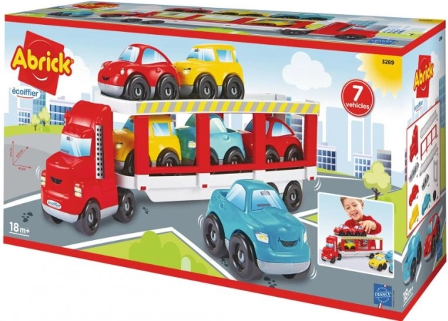 Atraktiivne Abricku autoveduk väikeste autode vedamiseks! Vedukil on allaklapitav ramp, mis võimaldab kuue värvilise auto lihtsat pealelaadimist ja mahalaadimist.