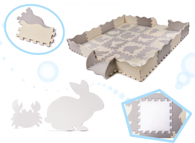 Suured vahtpuzzle tükid eemaldatavate loomakujunditega toetavad kujundite õppimist, loovust ja peenmotoorikat. Tükkidest saab hõlpsalt kokku panna tasase mati või tõstetud servadega aediku, mis piiritleb turvalise mänguala. Tekstuuriga pind on meeldiv puudutada ja ei libise.