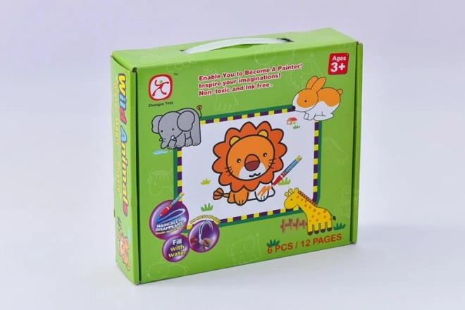 Toppimispusle Loomad ja veemaalimine on ideaalne kombinatsioon kujutlusvõime ja peenmotoorika arendamiseks. Lapsed saavad nautida kuut erinevat pilti – jänes, elevant, kaelkirjak, lõvi, sebra ja tiiger.