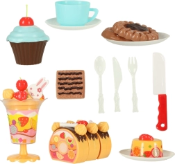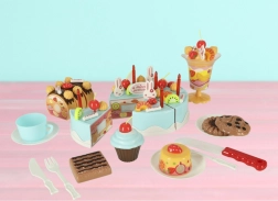 - Komplekti sisu (75 tk): 6× koogitükk, 5× küünal, 14× besee, 7× suhruppulk, 4× kirss, 4× mandariin, 3× maasikas, 3× kiivi, 4× jänes, 1× kiri, 3× taldrik, 3× küpsis, 3× rullbiskviidi viil, 3× tassikook, 1× tass, 1× teelusikas, 1× kahvel, 1× nuga, 1× koogilabidas, 1× jäätisepokaal, kleepsude komplekt, takjapaelade komplekt.