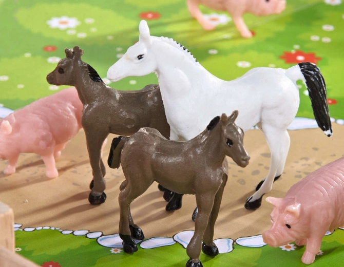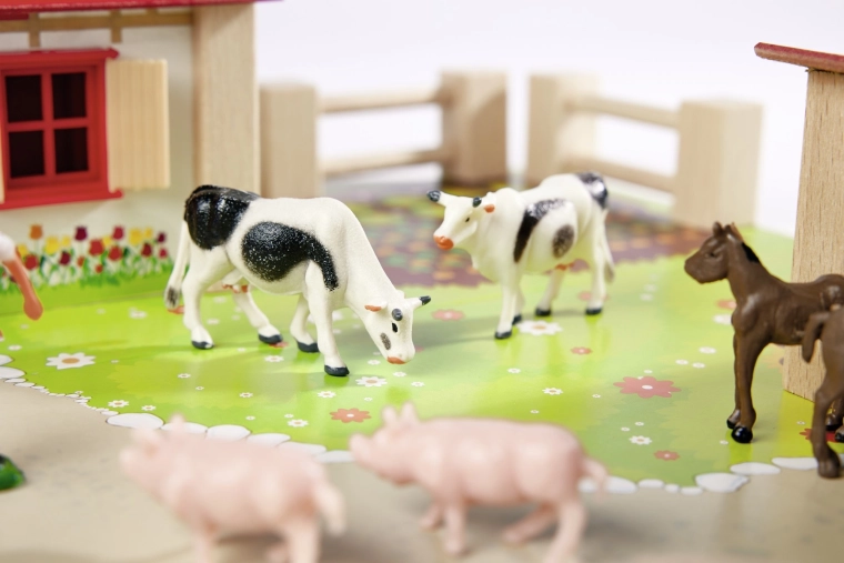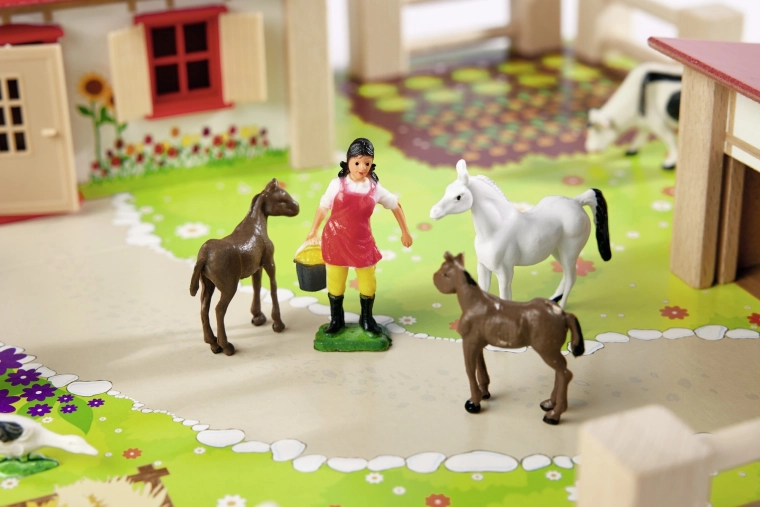 - maja, tall, värviline matt, aedikud/aiad, kleepsud, 12 kujukest (3 põrsast, 2 lehma, 3 hane, 3 hobust, talunik)
