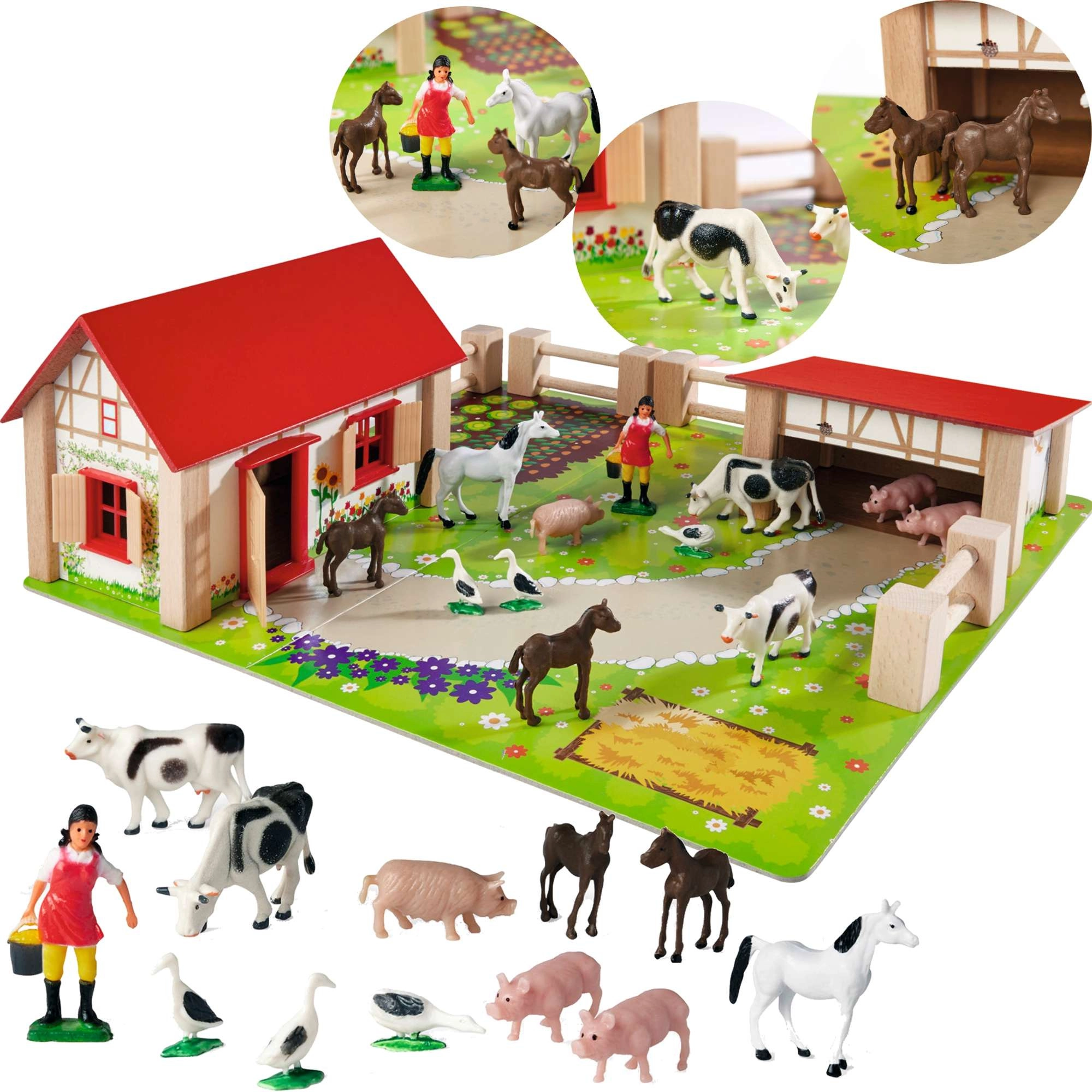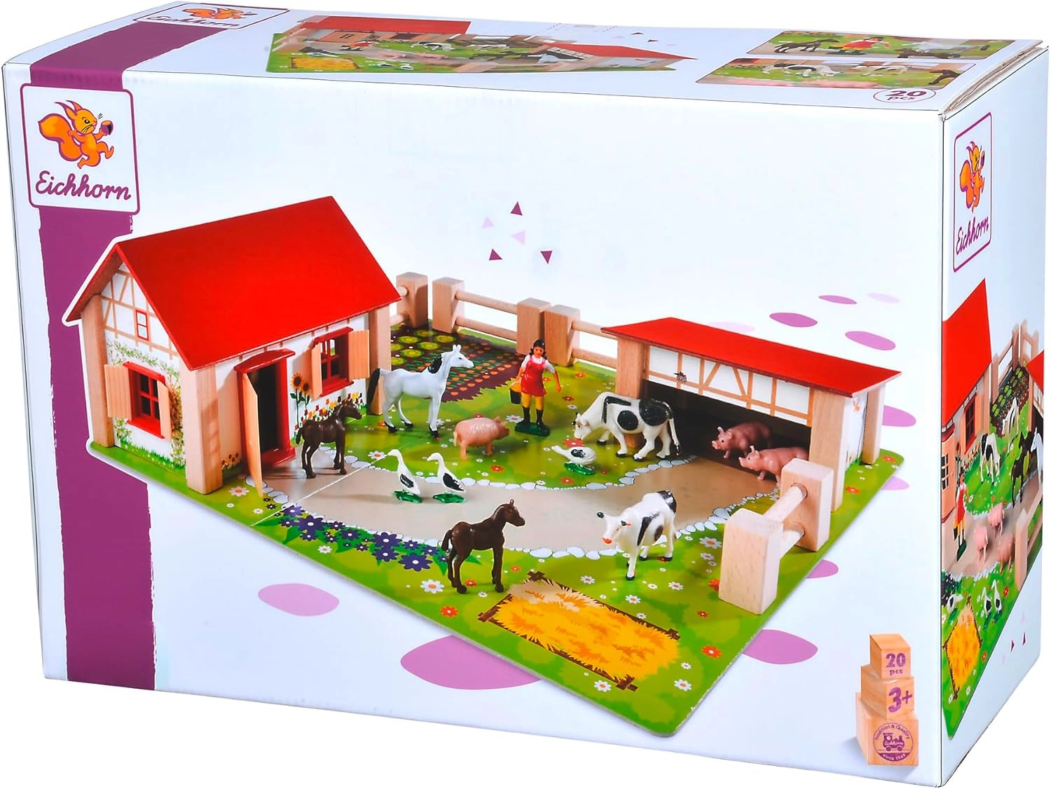 Avasta maaelu võlu EICHHORNi laste puidust taluga – täielik mängukomplekt maja, talli, aedikute ja 12 realistliku loomakujukesega. Pakub vastupidavat puidust teostust, värvilist mängumatti ja rikkalikku lisavarustust loovaks mänguks ja kujutlusvõime arendamiseks. Ideaalne alates 3. eluaastast lastele, kes armastavad loomi ja rollimängu talu eest hoolitsemisel.