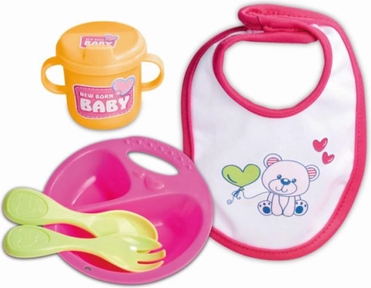 Armas nuku söögitarvete komplekt NEW BORN BABY sisaldab 5 osa – taldrik, teelusikas, kahvel, tass ja pudipõll – nukkudele 30–43 cm. Kerge ja kergesti puhastatav komplekt on ideaalne toitmismänguks ja peenmotoorika arendamiseks.